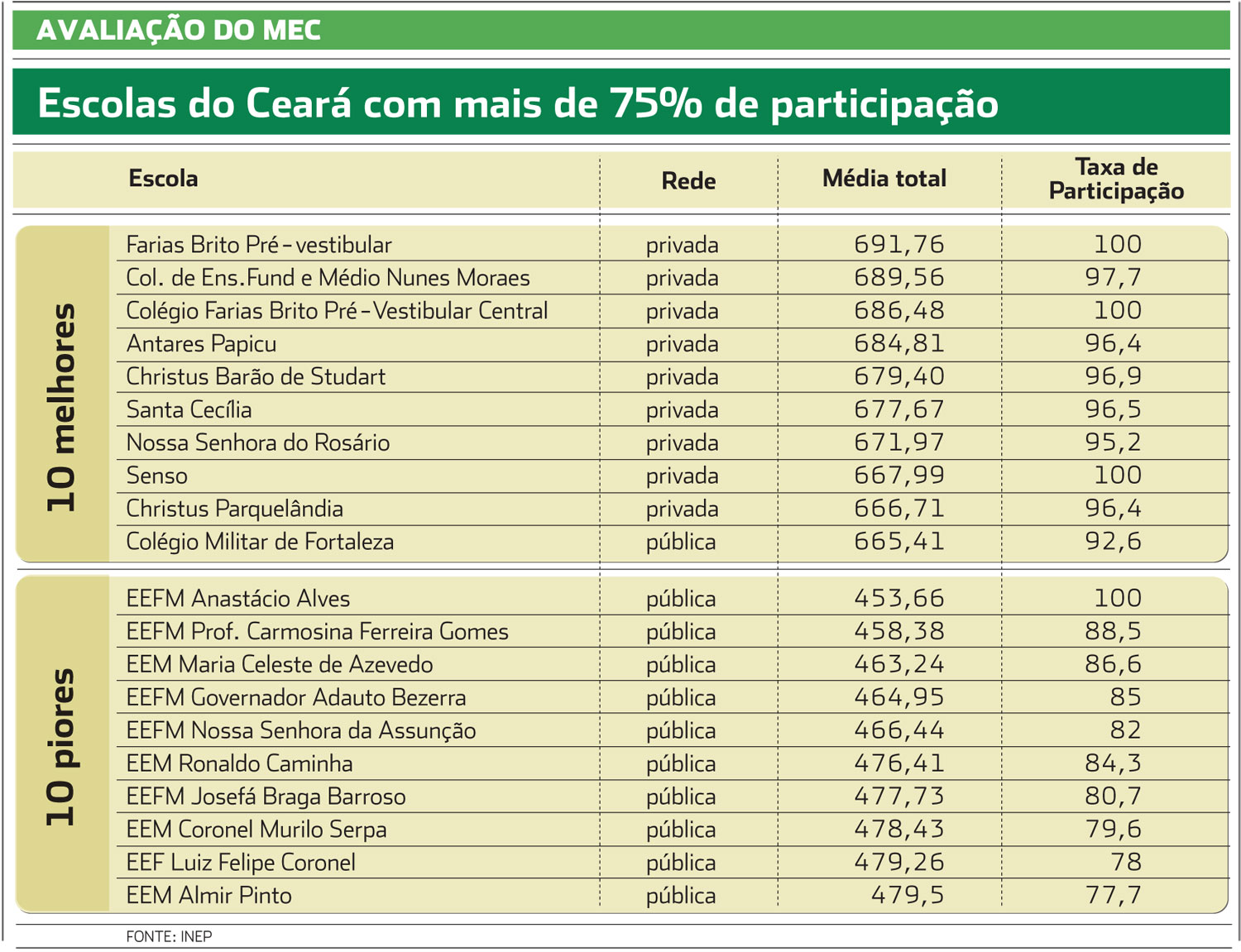 O Ceará obteve o segundo pior desempenho no ranking das 100 instituições com médias mais baixas do Exame Nacional do Ensino Médio (Enem) de 2010, da lista de escolas com mais de 75% de participação. Liderando o ranking está o Espírito Santo, com 31 instituições.